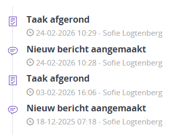 In het activiteitenoverzicht staan alle nieuwe activiteiten die binnen MyLogospace zijn geweest, zoals voltooide taken door cliënten, berichten, vragenlijsten etc.