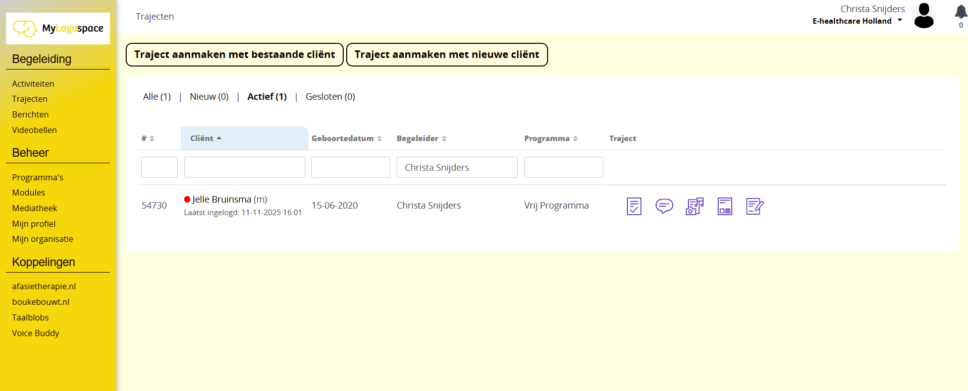 U komt na inloggen altijd in het overzichtscherm met aanwezige trajecten, zoals in onderstaande afbeelding. Verderop in de handleiding wordt nadere uitleg over de trajecten en de verschillende icoontjes gegeven.