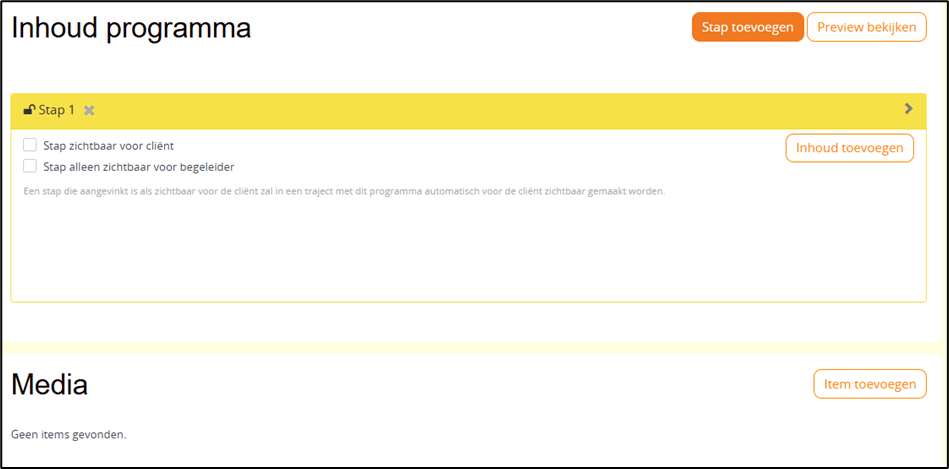 - Bij het aanzetten van to do’s ziet u rechts een onderdeel inhoud programma verschijnen. Hier kunt u stappen en taken toevoegen aan het programma. Bijvoorbeeld stap 1: introductie. Vervolgens kunt u inhoud toevoegen aan deze stap, zoals een mediatheek item of tekst.Let op: aanpassingen die u doet worden pas opgeslagen na klikken op programma opslaan. Heeft u aanpassingen gedaan maar nog niet opgeslagen en klikt u op een onderdeel in de gele balk links, op de knop terug of logt u uit, dan worden uw aanpassingen niet opgeslagen.