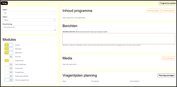 Een programma is een begeleidingsprogramma met stappen en taken dat door de cliënt gevolgd kan worden.
