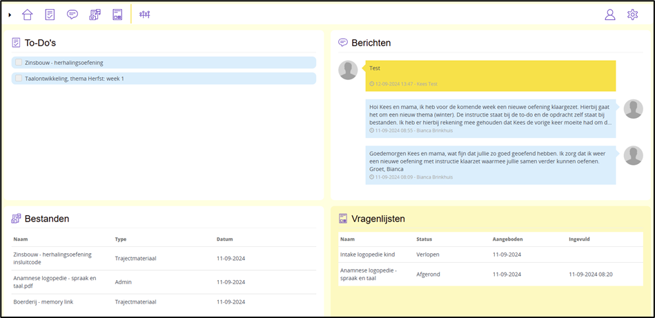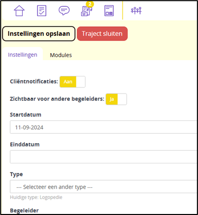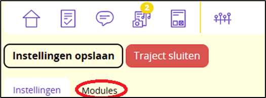 1. Helemaal bovenin staan de iconen met de actieve modus voor dit traject (bijvoorbeeld ‘to-do’s’ en ‘vragenlijsten’). Klik op een icoon om naar het detailscherm van de betreffende module te gaan.