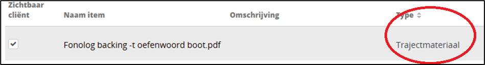 U kunt een bestand het type trajectmateriaal of admin geven. In beide gevallen zijn de bestanden ook zichtbaar voor de cliënt. U kunt zorginhoudelijk materiaal trajectmateriaal noemen en administratieve documenten admin.