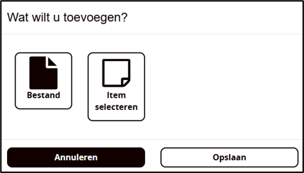 1. Klik op bestand om een bestand vanaf uw PC of laptop te uploaden. Klik op item selecteren om een bestand te selecteren dat in uw mediatheek staat. In de balk met de tekst ‘Selecteer bestand…’ kan je een zoekterm typen om de lijst te filteren en zo het juiste bestand te zoeken.
