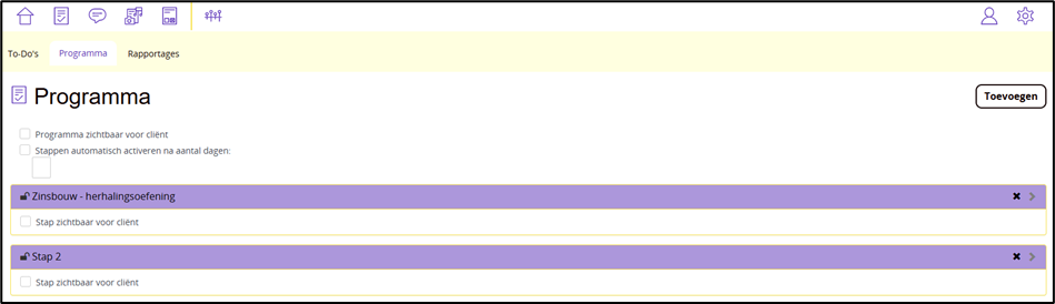 Het programma staat nu in zijn geheel onder het tabje programma. Alleen zorgverleners hebben dit tabje. U kunt vanuit hier aanvinken welke stappen u beschikbaar wilt stellen (zichtbaar wilt maken) voor de cliënt.